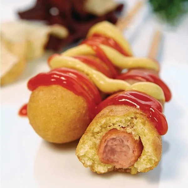 Corndogs sind leckere Würstchen am Spieß im knusprigen Maisteigmantel. Seine Wurzeln hat der Snack in den USA, wo seit Jahrzehnten Corndogs milliardenfach mit automatischen Produktionsanlagen als TK-Produkt für Supermärkte hergestellt werden.