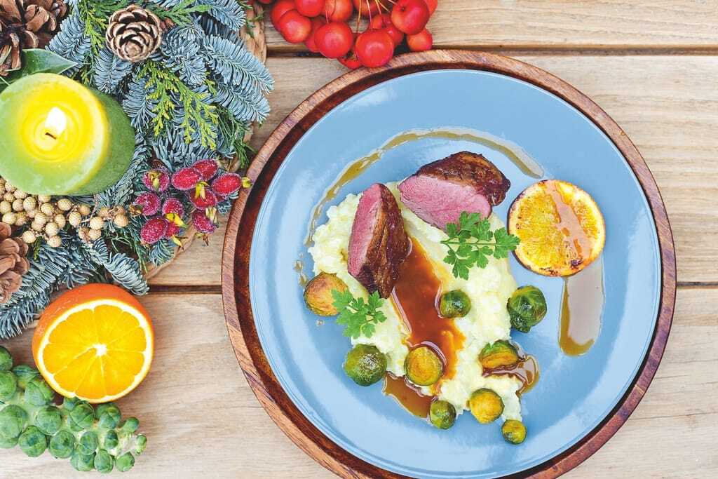 Die Haut der Entenbrust kreuzförmig einschneiden. Dabei nicht in das Fleisch schneiden. Mit der Hautseite in die heiße Pfanne geben. Für etwa drei bis vier Minuten braten, bis die Haut knusprig ist (keine Fett- oder Öl-Zugabe nötig). Nun wenden, mit Salz würzen, Orangenscheiben und Rosmarin in die Pfanne geben und diese für etwa zwölf Minuten bei 100 Grad Celsius in den vorgeheizten Backofen geben. Die Kerntemperatur sollte 70 Grad Celsius nicht überschreiten, wenn das Fleisch zart rosa sein soll. Zum Anrichten die Entenbrust mittig durchschneiden und auf dem Püree samt Rosenkohl anrichten. Als Sauce empfehlen wir eine eingedickte Wildjus (siehe Kasten).