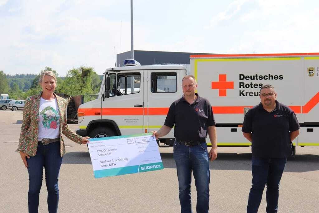 Der DRK Ortsverband Schwendi ist bei der Beschaffung eines neuen Ret-tungswagens auf Spenden angewiesen. Daher überreichte Carolin Grim-bacher, geschäftsführende Gesellschafterin von Südpack, am Betriebs-standort in Schwendi einen Scheck über 3.000 Euro an Klaus Boeckh und Tobias Lerch als Vertreter des Ortsverbands.