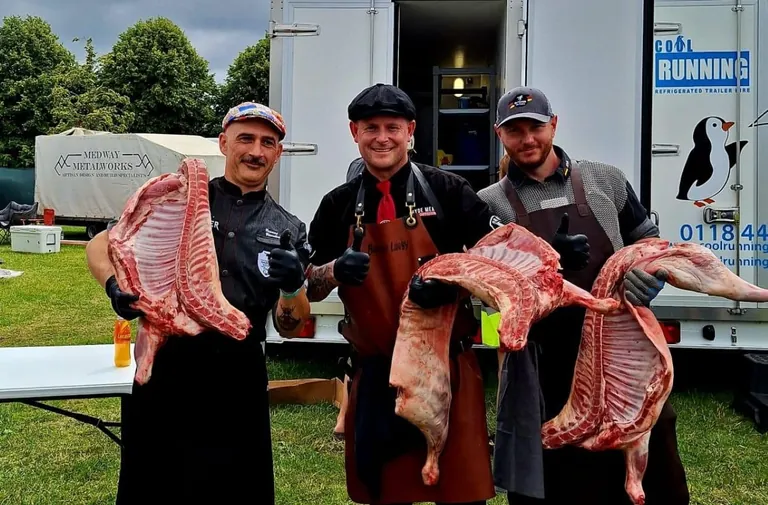 Sven Schumacher (rechts), hier zusammen mit dem dreifachen Weltmeister Brett Laws aus Australien (Mitte) und dem italienischen Fleischer Gianni Giardina (links), hat bei den World Butcher Wars in Ascot, England, teilgenommen. - © Kalieber GmbH / Sven Schumacher