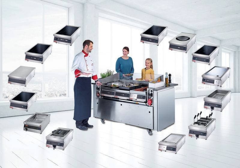 Die Multi-Flex-Line beinhaltet verschiedene Modelle: Multi4 Induktionskochfeld „GN“, Induktionswok, Wärmeplatte Ceran, Cerankochfeld mit zwei Kochstellen, Induktionsgrill „Single“, Elektrobräter, Elektrogrill „Single“, Pastakocher, Induktionskochfeld mit einer und zwei Kochstellen, Fritteuse, Bainmarie/Steamer und last, but not least das Neutral-Modul.