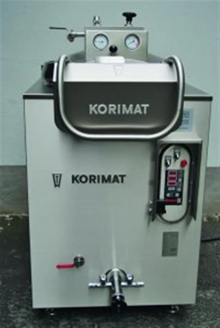 Die Korimat Metallwarenfabrik, Haiger-Weidelbach, stellt für diese Zwecke den Korimat Kessel-Autoklaven mit 120 l, 240 l und inzwischen auch mit 380 l Kesselinhalt her. Alle Geräte werden mit einer Mikroprozessorsteuerung ausgestattet, die folgende Funktionen erlaubt: Einstellung von Kesseltemperatur, Vorwahlzeit, Arbeitszeit, Kerntemperatur und Delta-Kochung. Zusätzlich kann mit dem integrierten F-Wertrechner der genaue F-Wert ermittelt, über einen externen Datenrecorder aufgezeichnet und später im PC abgespeichert werden. Nun können jederzeit benötigte Sterilisationsprotokolle ausgedruckt werden.
