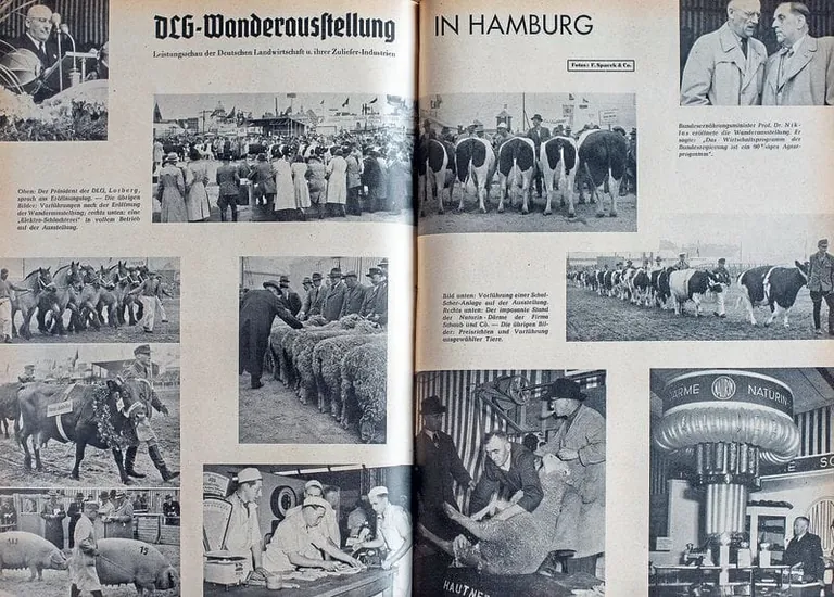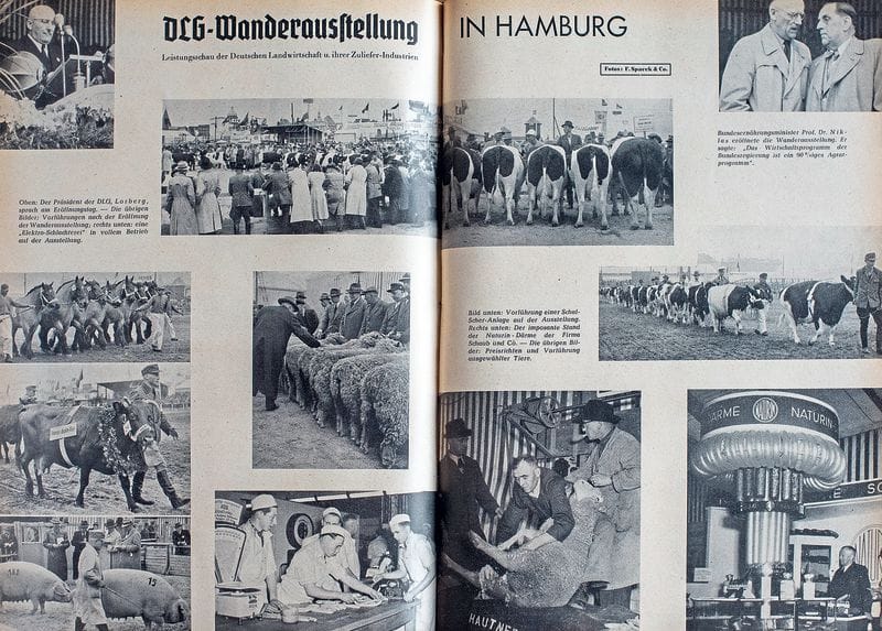 Im Juni 1951 berichtete die „Vieh- und Fleischwirtschaft“ über die Leistungsschau der Deutschen Landwirtschaft und ihrer Zuliefererfirmen. „Sonderzüge und Sonderautobusse brachten bereits am ersten Tag viele Tausende von auswärtigen Besuchern nach Hamburg.“ Auf dem Heiliggeistfeld dehnte sich auf einer 32 Hektar großen Fläche eine Ausstellungslandschaft, die ein schier unübersehbares Bild an landwirtschaftliche Technik und Arbeit anbot. Im Grußtelegramm des damaligen Bundeskanzlers, Konrad Adenauer, drückte sich die besondere Bedeutung dieser Schau aus. „Wir alle hätten vor sechs Jahren ein solch umfassende Schau landwirtschaftlichen Pioniergeistes nicht für möglich gehalten.“ Als besonderes „Glanzstück“ bezeichnete die Redaktion die elektrifizierte Musterfleischerei mit Würstchenverkauf der Schlachter-Innung Hamburg. „Der Stand ist so geschickt eingerichtet, dass die gesamte Arbeit vor aller Augen geschieht und jeder einmal aus nächster Nähe sehen kann, wie sauber und hygienisch einwandfrei ein moderner Fleischerbetrieb arbeitet.“