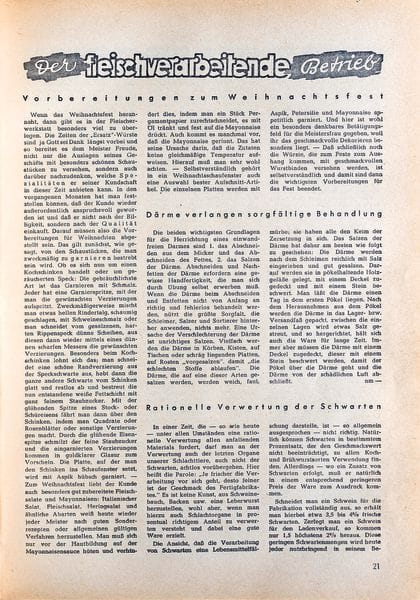 Zur Weihnachtszeit herrscht Hochbetrieb in Fleischer-Fachgeschäften. Bereits im Dezember 1950 konnte man feststellen, „dass der Kunde wieder außerordentlich anspruchsvoll geworden ist und dass er nicht nach der Billigkeit, sondern nach der Qualität einkauft“. Es wurde empfohlen, die Vorbereitungen für Weihnachten darauf hin abzustimmen. Die Schaustücke in den Auslagen sollten zweckmäßige Garnierungen aus Schweineschmalz erhalten. Weil der Kunde zu den Festtagen gut zubereitete Fleischsalate schätzte, verriet die „Vieh- und Fleischwirtschaft“ Tipps und Tricks für die Herstellung von Mayonnaise. „Man muss sich nur vor der Hautbildung auf der Mayonnaisensauce hüten und verhindert dies, indem man ein Stück Pergamentpapier zurechtschneidet, es mit Öl tränkt und fest auf die Mayonnaise drückt“. Selbstverständlich gehörten ins Weihnachtsschaufenster auch Aufschnitt-Platten. Hier war – ganz im Sinne des Frauenbildes der 50er Jahre – vor allem die Meisterfrau gefragt, „weil ihr das Dekorieren besonders liegt.“ Für die Präsentation der Würste wurden geschmackvolle Wurstgebinde empfohlen.