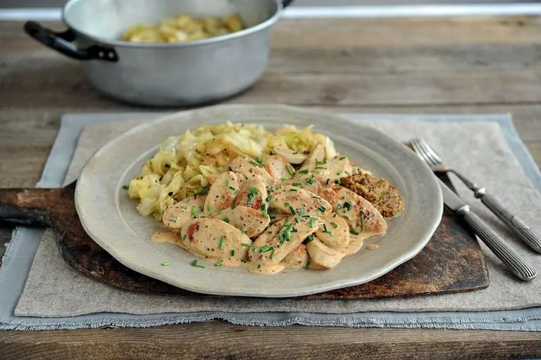 Weißwurstscheiben in Öl bei mittlerer Hitze zehn Minuten goldbraun braten. Sahne mit Gemüsebrühe, Kühne Senf körnig und Paprikapulver glattrühren, dazugießen und alles cremig einkochen lassen. Mit Salz und Pfeffer abschmecken, Schnittlauch unterrühren und mit Spitzkohl servieren. Tipp für eine leichte Variante: Die Weißwurst durch Putenbrust und die Hälfte der Sahne durch Joghurt ersetzen.