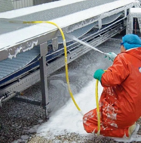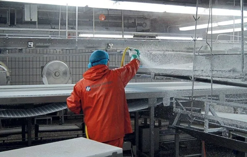 Reinigung ist stets Voraussetzung für Desinfektion. Zunächst erfolgt die grobe Vorreinigung mittels Abzieher und Besen mit anschließender Reinigung unter Einsatz von Wassertemperatur und -druck. Mit Wasser, das mit einem Druck von 20 bis 25 bar auf Anlagen und Böden gepresst wird, werden grobe Rückstände entfernt und die Voraussetzungen für einen anschließenden Schaumeinsatz geschaffen. Anlagen, Böden und Wände werden dabei mit Reinigungsmitteln von unten nach oben komplett eingeschäumt. Für den Reinigungserfolg ist es maßgeblich, dass die Oberflächen samt Poren und Spalten lückenlos benetzt werden. An schwer erreichbaren Flächen wird manuell gereinigt. Ist die erforderliche Einwirkzeit des Reinigungsmittels abgelaufen, wird in umgekehrter Richtung – von oben nach unten – damit begonnen, die Flächen zu reinigen. Tatsächlich kommt es auf die Richtung an: Würde die Reinigungsrichtung während des Prozesses variiert werden, bestünde die Gefahr einer Rekontamination.