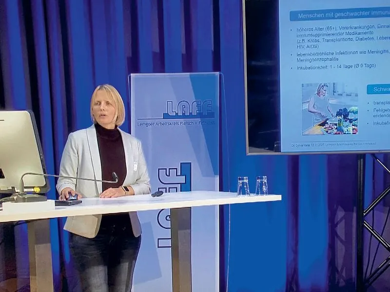 Die Auswirkungen von Listerien beim Menschen und ihr Vorkommen erläuterte Tierärztin Franziska Kumm (Institut für tierärztliche Nahrungsmittelkunde an der Justus-Liebig Universität Gießen). Gefährdet sind demnach immungeschwächte Personen. Die Symptome sind vielfältig und reichen von grippeähnlichen Ausprägungen bis zu Fehlgeburten bei Schwangeren.